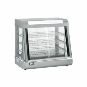Varmemonteren har tre høydejusterbare, nikkelbelagte grillehyller, integrert interiørbelysning som kan slås på og av separat, og sikkerhetsglass på alle sider for trygg og attraktiv eksponering av maten. De glideåpningsdørene på begge sider gjør det enkelt for personale å betjene varmemonteren fra flere vinkler. En vanntank for luftfuktighet sikrer at maten holder seg saftig og fersk over tid.