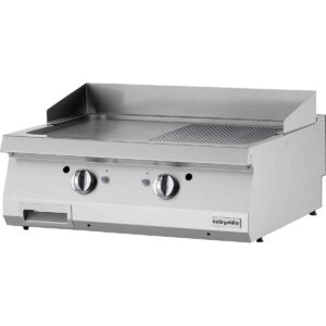 Profesjonell gassdrevet flatgrill i rustfritt stål fra Öztí, med kombinert stekeflate – halv rillet og halv slett topp. Gir både klassiske grillmerker og en glatt stekeflate for variert bruk. Perfekt til kjøtt, fisk, grønnsaker og burgere. Bygget for intensiv bruk i restaurant, hotell, catering, kantine, bakeri og storkjøkken.