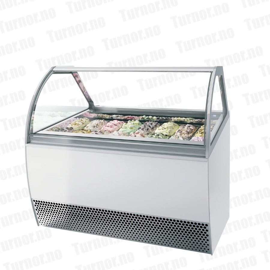 Buet nysbeskyttende glass, LED-belysning og oppvarmet frontglass sikrer at iskremen presenteres på best mulig måte uten kondens. Den ventilerte kjølingen og automatiske avriming med varmgass gir jevn temperatur, pålitelig drift og enkel vedlikehold.