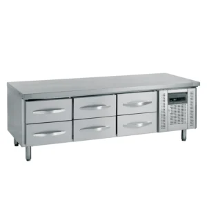 Profesjonell grillkjølebenk med 6 praktiske skuffer og slett topp, ideell for kjøkken med behov for effektiv kjøling og smart oppbevaring i kompakt format. Med målene 179,5 x 70 x 67 cm er denne benken perfekt tilpasset benkemontering under grill- eller stekeflater.